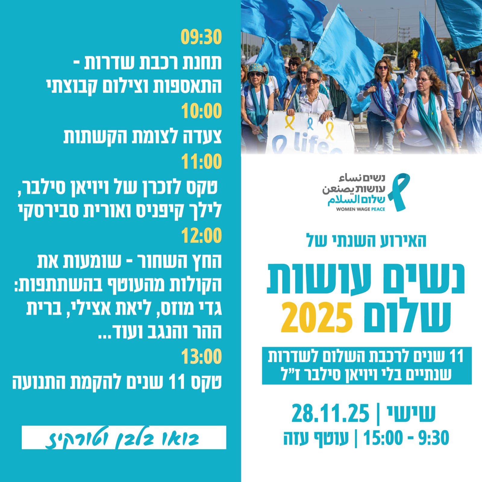 28/11/2025 @ 9:30 – 15:30 –   ב – 25 בנובמבר 2014, כ- 3 חודשים לאחר סיום צוק איתן, התקבצנו כ-1000 נשים מכל קצוות הארץ, נסענו ברכבת השלום לשדרות והתכנסנו למה שנחשב הכינוס הראשון של תנועת נשים עושות שלום.   מאז, במשך 11 שנים, אנחנו נאבקות, נחושות לעשות כל שביכולתנו לקדם הסכם מדיני שיביא סוף לכאב ולשכול בשני הצדדים. הדרך לא קלה, […]