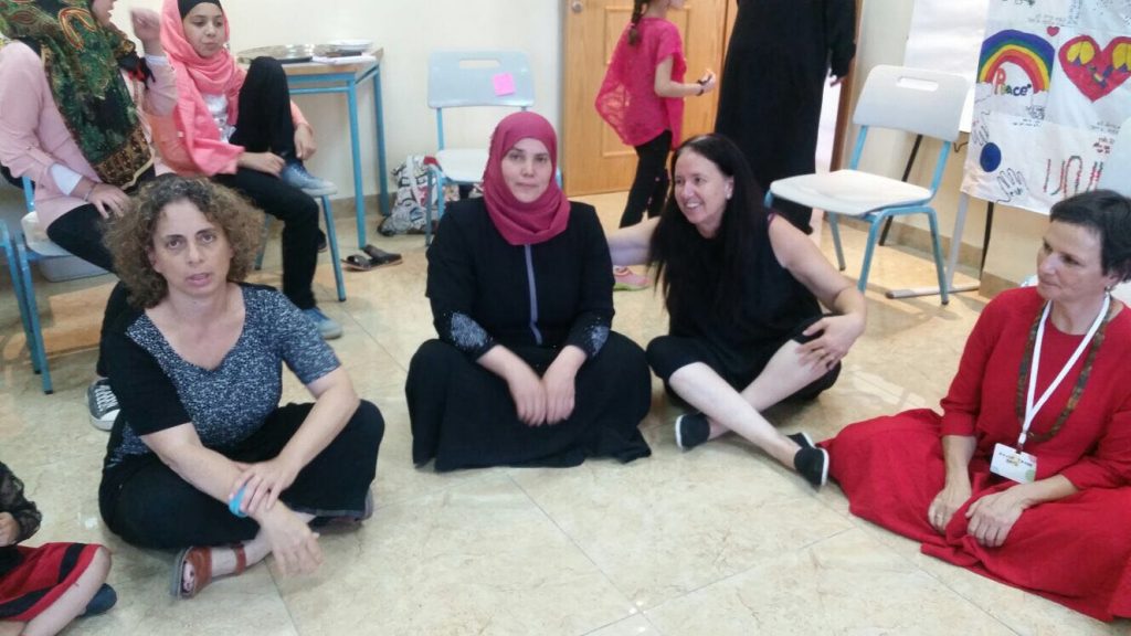 ב-15 ביולי נפגשנו למפגש ראשון של סלט מזרח תיכוני – 13 נשים מצוות קשרים עם נשים פלסטיניות כולל שתי שותפות פלסטיניות שלנו משועפת ומבית ג׳אללה ו-14 נשים פלסטיניות מאזור בית לחם. להפתעתנו (ולשמחתנו), הנשים הגיעו עם ילדיהן. רוב הנשים מאזור בית לחם לא דיברו אנגלית. לצד אורנה אשכנזי שהנחתה את המפגש, הנחתה ותרגמה סוזן עבד אלקדר. לרובן מלבד לסמיה המארגנת של המפגש, היה זה מפגש די ראשוני עם ישראליות וכך גם לילדיהן. עשינו מעגלי הכרות, צפינו בסרטון של תפילת האמהות, שיתפנו סיפורים אישיים על מקרים בהם גילינו אומץ.  סמיה הנחתה מדיטציה (היא מורה ליוגה, עטופה בחיג׳אב), ציירנו פיסות שלום ואכלנו יחד ארוחת ערב קלה. בשיתופים האישיים עלו סיפורים כואבים ולא פשוטים, שפתחו את הלב (ואת מאגרי הדמעות). הצוות מתנועת נשים עושות שלום היה מגוון, מגזרית ופוליטית. לאלה שחוו מפגש ראשון עם פלסטיניות ושמעו פעם ראשונה סיפורים מהצד השני, הייתה חוויה פותחת לב ומטלטלת (במובן הנוגע והמרחיב) שליוותה אותה גם בימים אחרי המפגש.