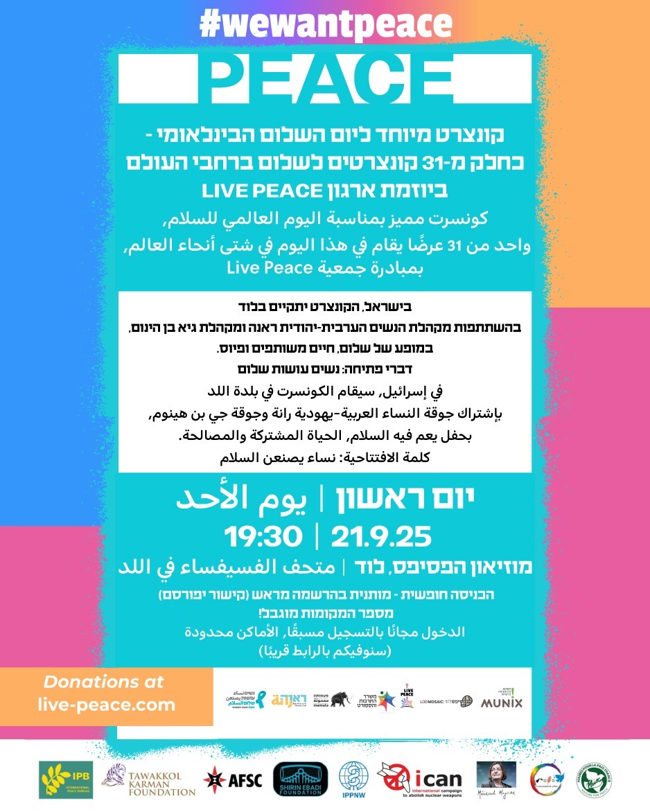 נשים עושות שלום הוזמנו להיות נותנות החסות של הקונצרט בישראל, שיתקיים במוזיאון הפסיפס בלוד בהשתתפות שתי מקהלות: מקהלת הנשים הערבית-יהודית ראנה ומקהלת גיא בן-הינום.