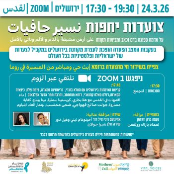 24/03/2026 @ 16:00 – 19:00 – דווקא כשהמציאות מטלטלת, קול האימהות חייב להישמע חזק מאי פעם. על אף המאמצים, עקב המצב לא נוכל לקיים צעדה פיזית בירושלים ב-24.3 אבל הקריאה שלנו לשלום לא נעצרת! אנו מזמינות אתכן להצטרף בזום לעצרת מקוונת שתחבר בין ירושלים לרומא ובין תקווה לעשייה נשמיע את קולן של אימהות בקריאה משותפת ליציאה ממעגל הדמים. נצפה בשידור חי […]