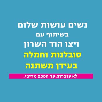14/01/2018 @ 18:30 – 21:30 – נשים עושות שלום היא תנועה בלתי מפלגתית של אלפי נשים בכל הארץ הפועלות במרחב הציבורי והפוליטי. התנועה פועלת להשיב את חזון השלום למרכז השיח הציבורי ולהוביל לפתרון לא אלים, מכבד ומוסכם של הסכסוך הישראלי פלסטיני. חברות בתנועה נשים בעלות דעות שונות, גילאים שונים, יהודיות וערביות, חילוניות ודתיות. מוזמנות למפגש ביום ראשון 14.1.18 ב-18:30 הר כנען 7 דירה 3, מבשרת ציון […]