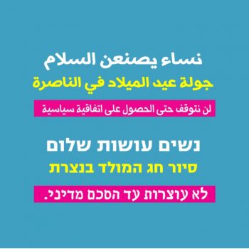 28/12/2017 @ 10:00 – 14:30 – נשים עושות שלום מזמינות אתכן לסיור חג המולד בנצרת ניפגש ביום שישי 28.12.18 בשעה 10:00 במעיין מרים, רח' בשארה 55 (ליד עץ חג המולד) נצא לסיור מודרך בכנסיות, באתרים החשובים ובשוק חג המולד. נתארח בבית הפולקלור אלסיבאט שמציג את החיים בנצרת כפי שהיו במאה ה-19. שם נאכל ארוחה קלה. דמי השתתפות לכיסוי הוצאות: 40 ש"ח אנא אשרו השתתפות: סלוא עיאד 050-7714510 نساء يصنعن السلام يدعونكن لجولة عيد الميلاد في الناصرة وذلك يوم الجمعة 28.12.18 الساعة 10:00 بساحة العين، شارع البشارة 55بجانب شجرة الميلاد سنقوم بجولة مع إرشاد في الكنائس والمعالم الهامة وفي سوق عيد الميلاد. سنكون بضيافة بيت السباط للتراث والذي يعرض تراث الناصرة في المئة التاسعة عشر، وسنأكل وجبة خفيفة هناك. رسوم الاشتراك لتغطية مصاريف الجولة : 40 شيكل الرجاء تأكيد المشاركة: سلوى عياد 050-7714510