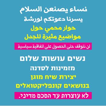 25/12/2017 @ 14:15 – 17:00 – הצטרפו אלינו לכנסת הנשים של נשים עושות שלום!. חובה להירשם מראש! ============================================================================ מידי יום שני אנחנו מגיעות לכנסת, עשרות נשים עושות שלום, וצובעות אותה בלבן של תקווה. אנחנו נמצאות בלב העשייה המדינית, נפגשות עם חברי כנסת, יושבות במזנון, עולות למליאה. מזכירות שוב ושוב שסכסוכים נפתרים בהסכם מדיני, ושהסכם כזה צריך להיות הבחירה האסטרטגית של נבחרי […]