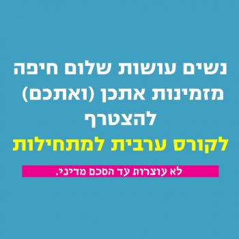 27/11/2017 @ 17:30 – 19:00 – נשים עושות שלום חיפה מזמינות אתכן (ואתכם) להצטרף לקורס ערבית למתחילות המפגש הראשון יתקיים ביום שני 27.11.17 בשעות 17:30–19:00 בבית הגפן, בנין התיאטרון שד׳ הציונות 33, קומה א׳, חיפה הקורס ישים דגש על דיבור קל, אוצר מילים שימושי, מילות מפתח וברכות עיקריות בשפה הערבית בניב הפלסטיני. יעשה שימוש בספר לימוד שיומלץ עליו במפגש הראשון. המפגש […]
