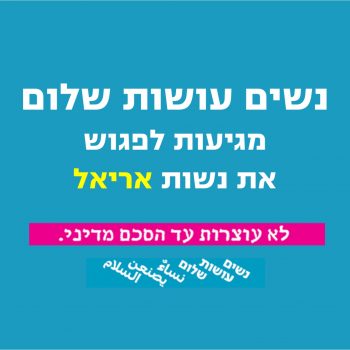 12/09/2017 @ 20:00 – 22:00 – נשים עושות שלום באות לפגוש את נשות אריאל יום שלישי 12.9.2017, כ”א באלול, בשעה 20.00 באשכול הפיס, רח׳ העצמאות 5, אריאל (החניה ברח׳ דרך אפרתה) בתכנית: – הצגת תנועת נשים עושות שלום – פאנל משותף לנשות אריאל ונשים עושות שלום – מעגלי שיח בהשתתפות: אפרת צימרמן, ציפי עראמי, שרה רוזנפלד, ליאורה הדר, ז’ניה פרוז’נסקי, יהלומה זכות, […]