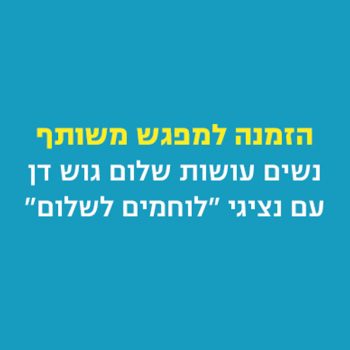 26/02/2017 @ 19:30 – 21:30 – נשים עושות שלום מגיעות לחוג בית ביום ראשון 26.2.17, בשעה 19:30 ברחוב מונטיפיורי 23, קרית אונו. נשים עושות שלום היא תנועה בלתי מפלגתית של אלפי נשים בכל הארץ הפועלות במרחב הציבורי והפוליטי. התנועה פועלת להשיב את חזון השלום למרכז השיח הציבורי ולהוביל לפתרון לא אלים, מכבד ומוסכם של הסכסוך הישראלי פלסטיני. חברות בתנועה נשים בעלות […]