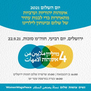 22/09/2021 @ 16:00 – 19:00 – יום השלום 2021 – נשים עושות שלום אימהות יהודיות וערביות עושות שלום ביחד למען עתיד ילדינו! אל מול המציאות המתוחה בימים האחרונים נגיע לירושלים ונקיים את עצרת האימהות. נזכיר שהשלום עדיין לא כאן ושנעשה הכל כדי להביא אותו. נעמוד יחד בשרשרת אנושית לאורך חומות ירושלים ונקיים את עצרת האימהות בתקווה שקולנו יישמע […]