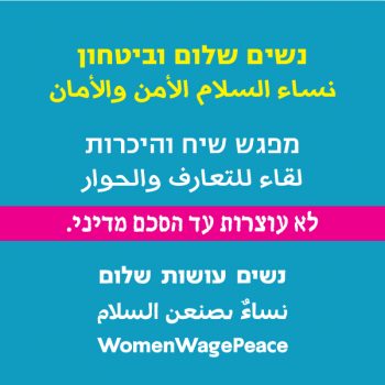 12/08/2021 @ 19:30 – 21:30 – נשים עושות שלום השרון הדרומי משוחחות עם היוזמה לצמצום הסכסוך במפגש נשוחח על תנועת נשים עושות שלום ועל היוזמה לצמצום הסכסוך, ונבחן יחד את הקשר בין צמצום הסכסוך לבין קידום הסכם מדיני לפתרון הסכסוך. מנחה: ג׳ולי סיטקוב בוגין, רכזת שטח, נשים עושות שלום יום חמישי 12.8.21 בשעה 19:30 בית משפחת בוגין, המייסדים 7 כפר מל״ל […]
