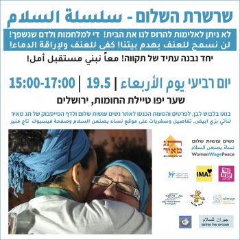 19/05/2021 @ 15:00 – 19:00 – זה הרגע של כולנו! הערביות והיהודיות, הדתיות והחילוניות, האימהות והאבות, הצעירים והצעירות, האחים והאחיות מכל חלקי החברה וכל הקשת הפוליטית – לשלב ידיים ולעשות שרשרת אנושית של תקווה. هذه اللحظة بالنسبة لنا! عربيات ويهوديات ،متدينات وزمنيات،أمهات وآباء،أخوة وأخوات -يد بيد لنصنع سلسلة بشرية من الأمل . זוהי תמונת הניצחון של כולנו! هذه لوحة انتصارنا كلنا […]