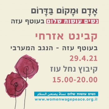 29/04/2021 @ 15:00 – 20:00 – הצטרפו אלינו לקבינט האזרחי בעוטף עזה, בהשתתפות תושבות ותושבי האזור, ארגונים, חברי/ות כנסת ונשים עושות שלום. יום חמישי, 29.4.2021, בשעות 15:00 – 20:00 במועדון נחל עוז התוכנית: 15:00 – 15:30 – התכנסות, הרשמה וקפה. 15:30 – פתיחה ליד […]