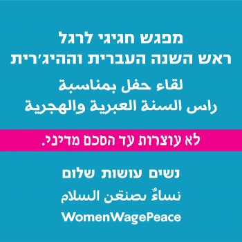 22/09/2020 @ 20:00 – 22:00 – נשים עושות שלום מרחב דן תנועת נשים עושות שלום מתחילה את השנה בקריאה: גם לדרום מגיע שלום אנו מזמינות אותך למפגש חשוב ומרגש עם חברות מישובי הדרום, שתבאנה קולות מגוונים על חיים של נשים ומשפחותיהן באיזור סכסוך מתמשך משתתפות בפאנל: גילי זיון קבוץ סעד | יונה גרוסמן מושב עין הבשור נעמיקה ציון קיבוץ עירוני שדרות […]