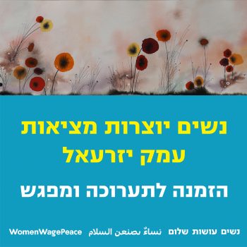 17/10/2020 @ 17:00 – 19:00 – נשים עושות שלום וחברים מוזמנות ומוזמנים לתערוכה של נשים ערביות ויהודיות: נשים יוצרות מציאות עמק יזרעאל מוצאי שבת 17.10.20 בשעה 17:00 (מועד האירוע נתון לשינויים בהתאם לנסיבות) מירווח גלריה לאומנות בהרדוף – רחאב עבד אל חלים ממנשיה זבדה תספר על מפעל חייה – המלחינה והציירת הגר קדימה תספר על עבודת האמנות שיצרה לכבוד רחאב – […]