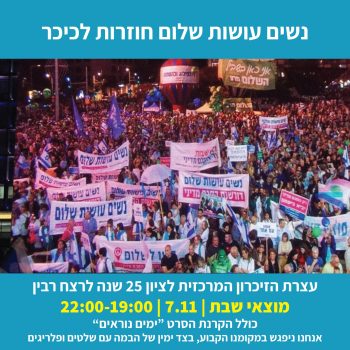 21/09/2020 @ 19:30 – 21:30 – נשים עושות שלום מזמינות למפגש: מה קורה היום עם השלום? בהשתתפות שועאע מנסור, ראש העיר טייבה דוברות ודוברים: גדיר האני כלת פרס ״התקווה הישראלית״, רכזת היגוי בנשים עושות שלום וחברה בארגונים למען חיים משותפים ושלום שועאע מנסור ראש העיר טייבה ג׳ואד מסארוה פעיל חברתי ומומחה לזכויות לאנשים עם מוגבלויות וצרכים מיוחדים ד״ר נמרוד גורן מייסד […]