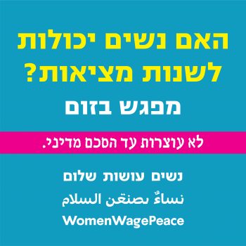 26/08/2020 @ 17:00 – 18:30 – נשים עושות שלום מרחב דן מזמינות אותך להרצאה ודיון בנושא: נשים והתמודדות אישית, חברתית ופוליטית מנחות: חנה פנחסי ולי-את אספיר ימי רביעי: 26.8.20 | 2.9.20 | 9.9.20 | 16.9.20 בשעות 17:00-18:30 רח׳ מטלון, תל אביב | קבוצה סגורה האירועים יתקיימו בהתאם להנחיות הקורונה לפרטים: חנה פנחסי 054-5570806