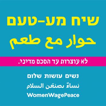 05/01/2020 @ 17:30 – 19:30 – האם יש אפשרות למנוע את סבב הלחימה הבא? למה הקבינט מתכנס רק כשהטילים באוויר? מה תפקידה של תנועת שטח אזרחית בימים אלו? לי-את אספיר ברקוביץ מתנועת נשים עושות שלום תתן תשובות לשאלות. בואו לשמוע, לשאול ולדון. יום ראשון 5.1.20 | בשעה 17:30 | רמת גן כתובת: הרי הגלעד 9, רמת גן (קומה 10, משפ' טמבור) […]