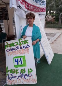 ביולי 2015 חברתי אוה הציעה לי לנסוע לירושלים, לאוהל של קבוצת "נשים עושות שלום". הסתקרנתי, הגעתי ל"אוהל צום איתן". ראיתי נשים עם ברק בעיניים, עם תקווה ואמונה שאפשר להגיע להסכם שימנע את המלחמה הבאה, ולנו הנשים יהיה תפקיד חשוב. נשביתי לתנועה. חזרתי שוב לאוהל ושם "גויסתי" על ידי חברות דרומיות. ואז התחלתי להגיע לעמידה בצומת שוקת וצומת ערד, להקרנות הסרט על נשות ליבריה ועוד פעילויות בדרום.