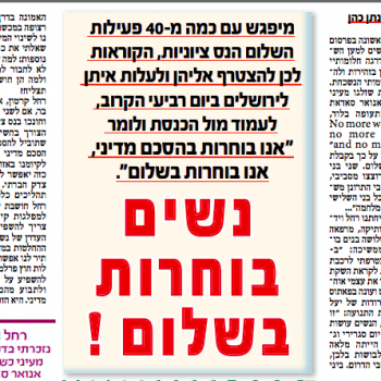 שיחה עם כמה מ-40 פעילות השלום הנס ציוניות, וביניהן רחל וידמן, רחל קרטון ונאוה פולק, על מהות תנועת נשים עושות… קרא עוד »